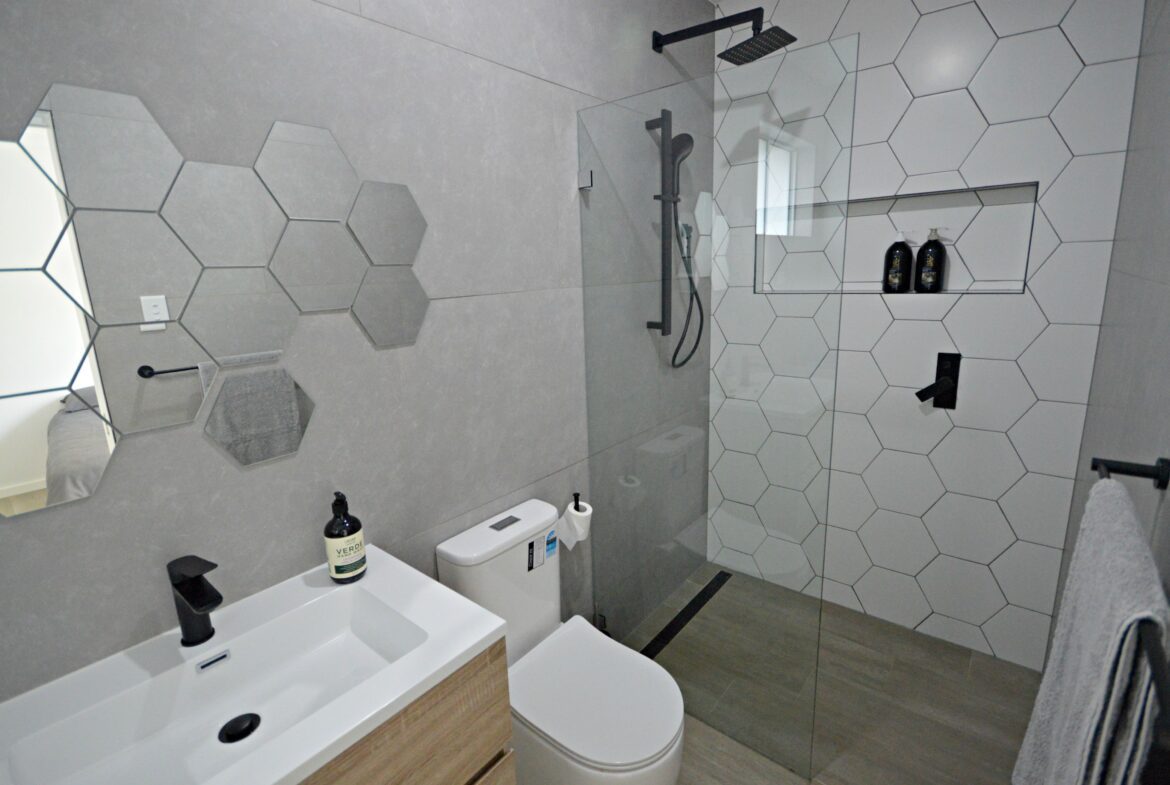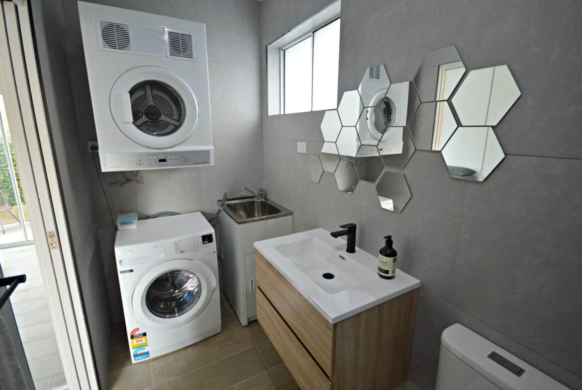 • En-suite bathroom with matte black fixtures, floor to ceiling tiles and integrated laundry