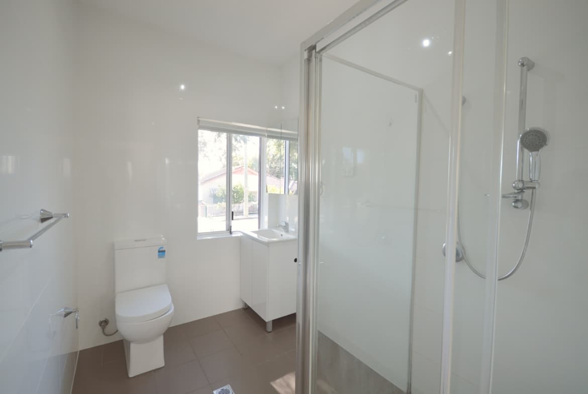 - Modern bathroom with integrated laundry and floor to ceiling tiles
